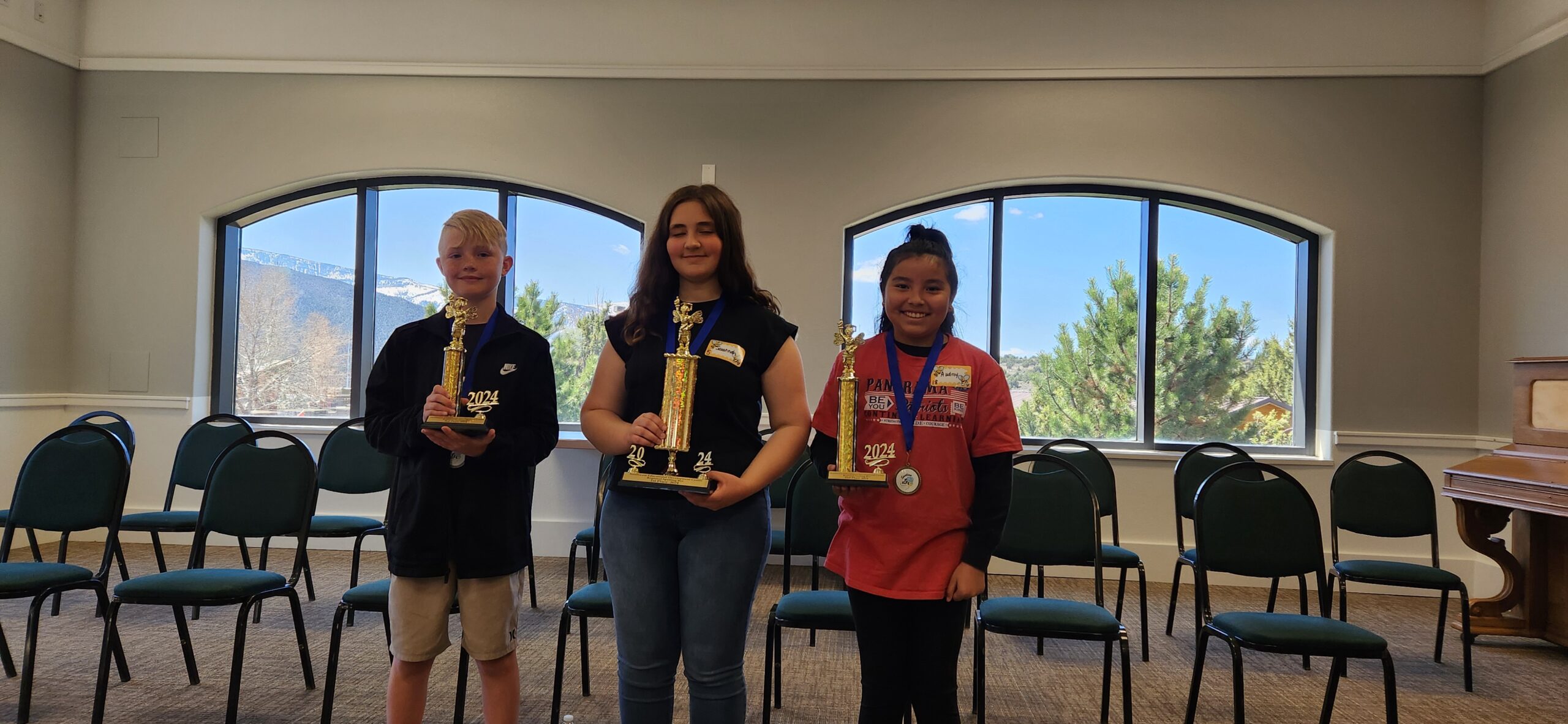 6th Annual Southwest Educational Development Center Regional Spelling Bee Finalists, L to R: Hayes Holyoak from Delta Middle School, Millard School District; Savannah Paul from Pine View Middle School, Washington SD and Audrey Ayala from Panorama Elementary in Washington SD.