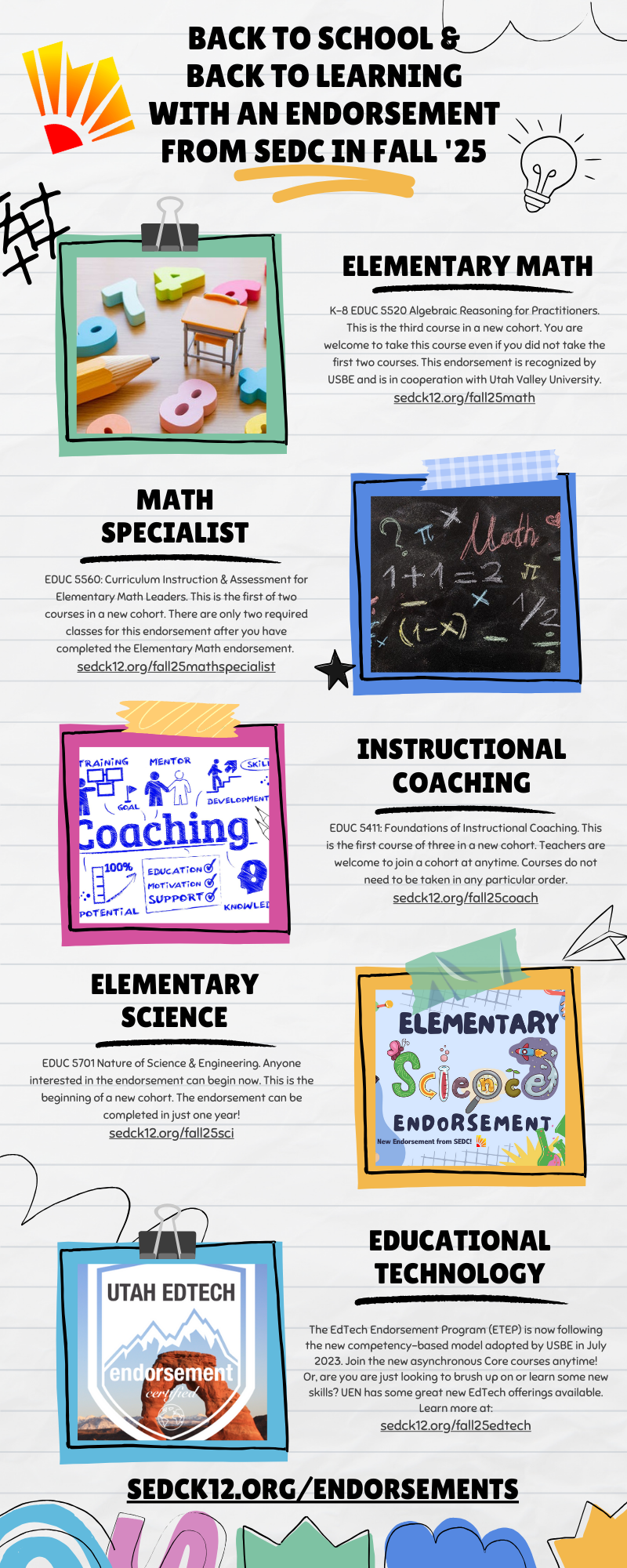 A flyer titled "BACK TO SCHOOL & BACK TO LEARNING WITH AN ENDORSEMENT FROM SEDC IN FALL 2025," designed to look like a bulletin board with paper clippings. The graphic highlights five endorsement opportunities. The first, **Elementary Math**, advertises the "K-6 EDUC 5520 Algebraic Reasoning for Practitioners" course with an image of a miniature classroom. Next is **Math Specialist**, promoting the "EDUC 5560: Curriculum, Instruction & Assessment for Elementary Math Leaders" course, accompanied by an image of a blackboard with math equations. The third opportunity, **Instructional Coaching**, features the "EDUC 5411: Foundations of Instructional Coaching" course and a stylized drawing of a coaching workflow. The fourth section is for **Elementary Science**, highlighting the "EDUC 5701 Nature of Science & Engineering" course and a colorful illustration with science-themed imagery. The final section is for **Educational Technology**, highlighting the "EdTech Endorsement Program (ETEP)" with a badge that says "Utah EdTech endorsement certified." Each endorsement section includes a brief description and a unique URL for more information. The bottom of the flyer provides the main URL `sedck12.org/endorsements`.